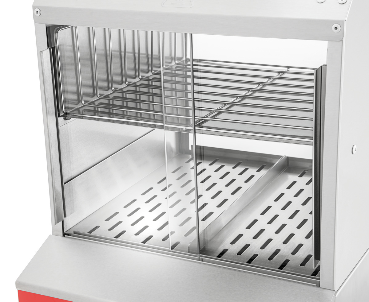 Der Hot Dog Dämpfer erwärmt und hält bis zu 100 Hot Dog Würstchen und bis zu 15 Hot Dog Brötchen warm. Die Glasfront auf der Kundenseite und das ansprechende Design laden Jung und Alt zum typisch amerikanischen Genuss ein.